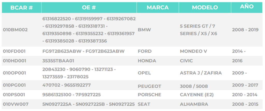 Para más información sobre modelos específicos y referencias, escríbenos a la dirección de correo electrónico: customerservice@bcarparts.com o contacta directamente con tu Responsable de Zona.